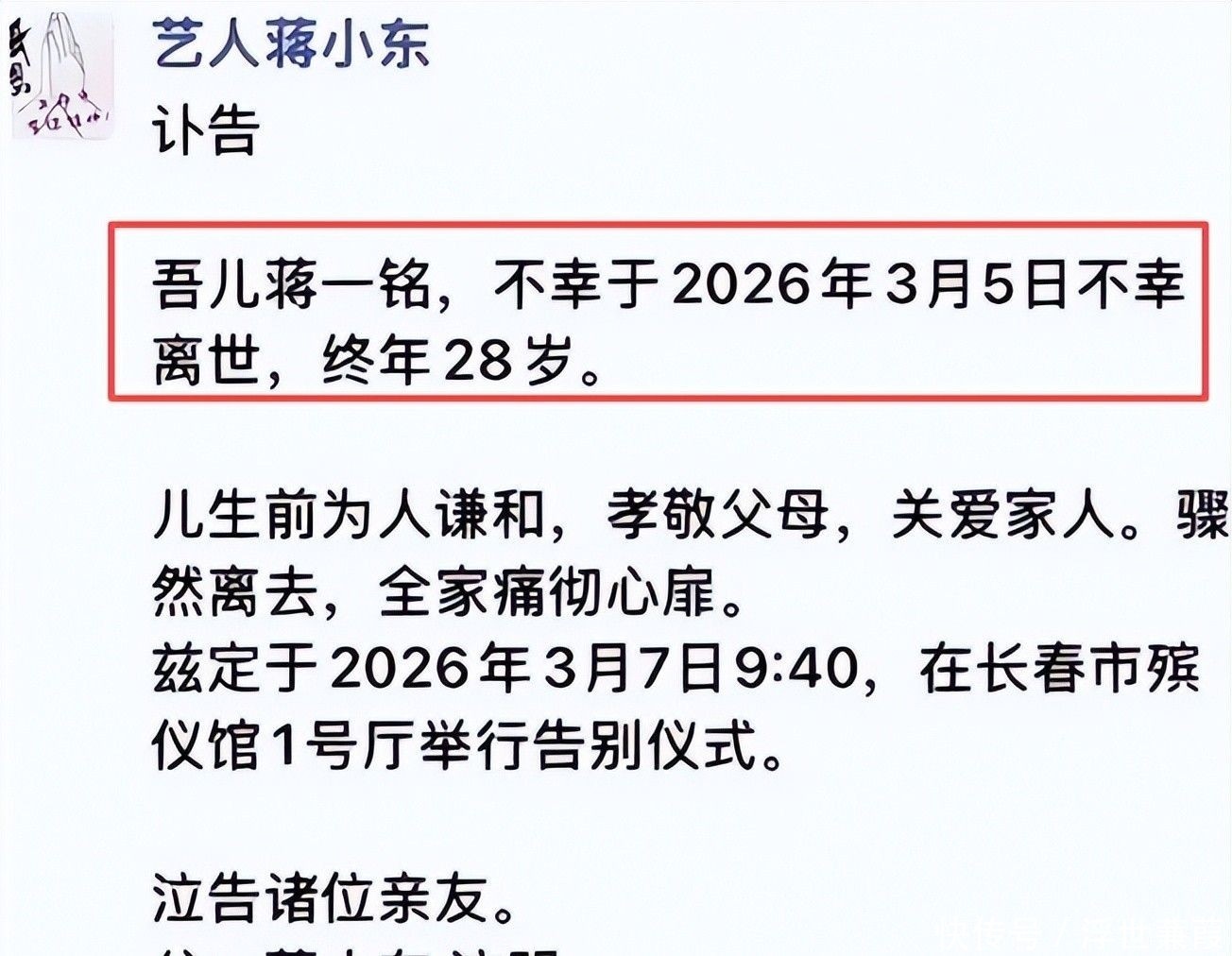 他在个人社交账号上发布了正式讣告,纸面肃穆、字字沉痛:其独子蒋一铭,年仅28岁,于3月5日深夜骤然离世;遗体告别仪式定于3月7日上午9时40分,在长春殡仪馆举行。